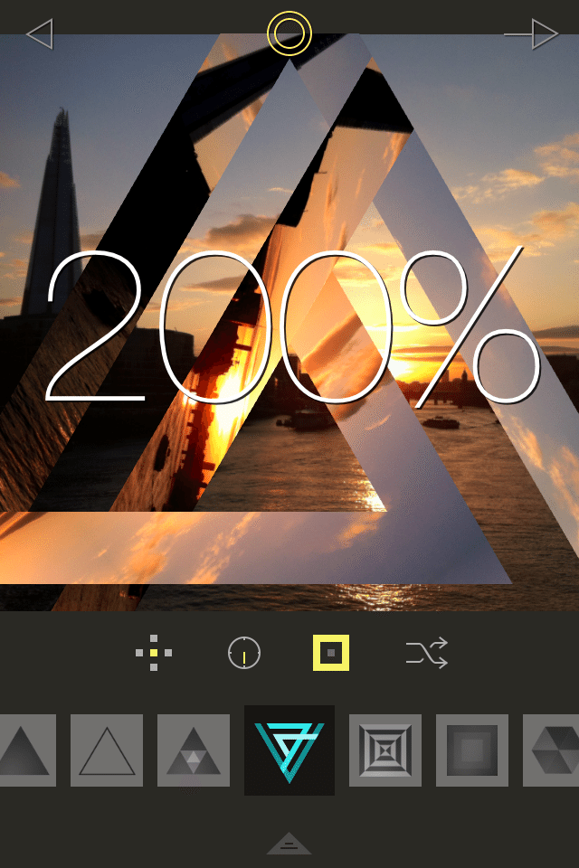 The main 4 editing tools, represented by 4 icons at the bar below the image, can be used (from left to right) to change the position, change the angle, control the size, and the last one is to go random.