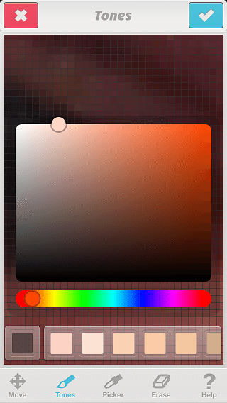 The Tones tool is basically the tool to use when you want to ‘re-colour‘ part of the image. Here you can see from the screenshot that Facetune allow you to Zoom in amazingly detailed down to the pixel level!